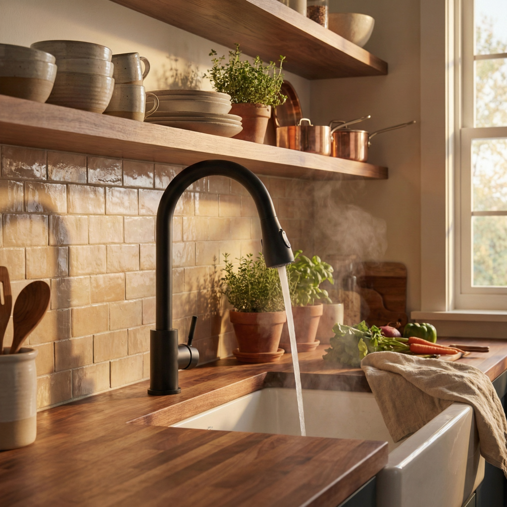 Ce modèle intègre un sélecteur à bouton permettant de basculer entre trois modes d'écoulement : un jet laminaire classique, un jet pluie (douchette) et une fonction "Pause" pour l'arrêt momentané de l'eau. Le bec principal pivote à 360 degrés. L'installation est prévue pour les éviers standards. Le produit est décliné en trois finitions : Gris, Noir et Or.
