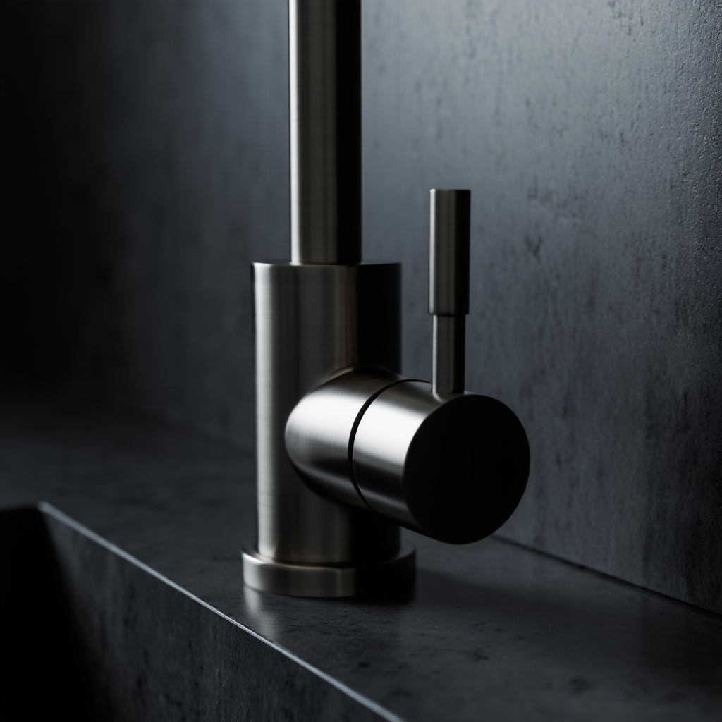 La gestion de l'ouverture d'eau et le mélange chaud/froid s'effectuent via un levier latéral unique (système monocommande). L'installation est prévue pour une pose sur plage (directement sur l'évier ou le plan de travail). Ce modèle est décliné en quatre finitions : Chrome, Noir, Nickel et Or.