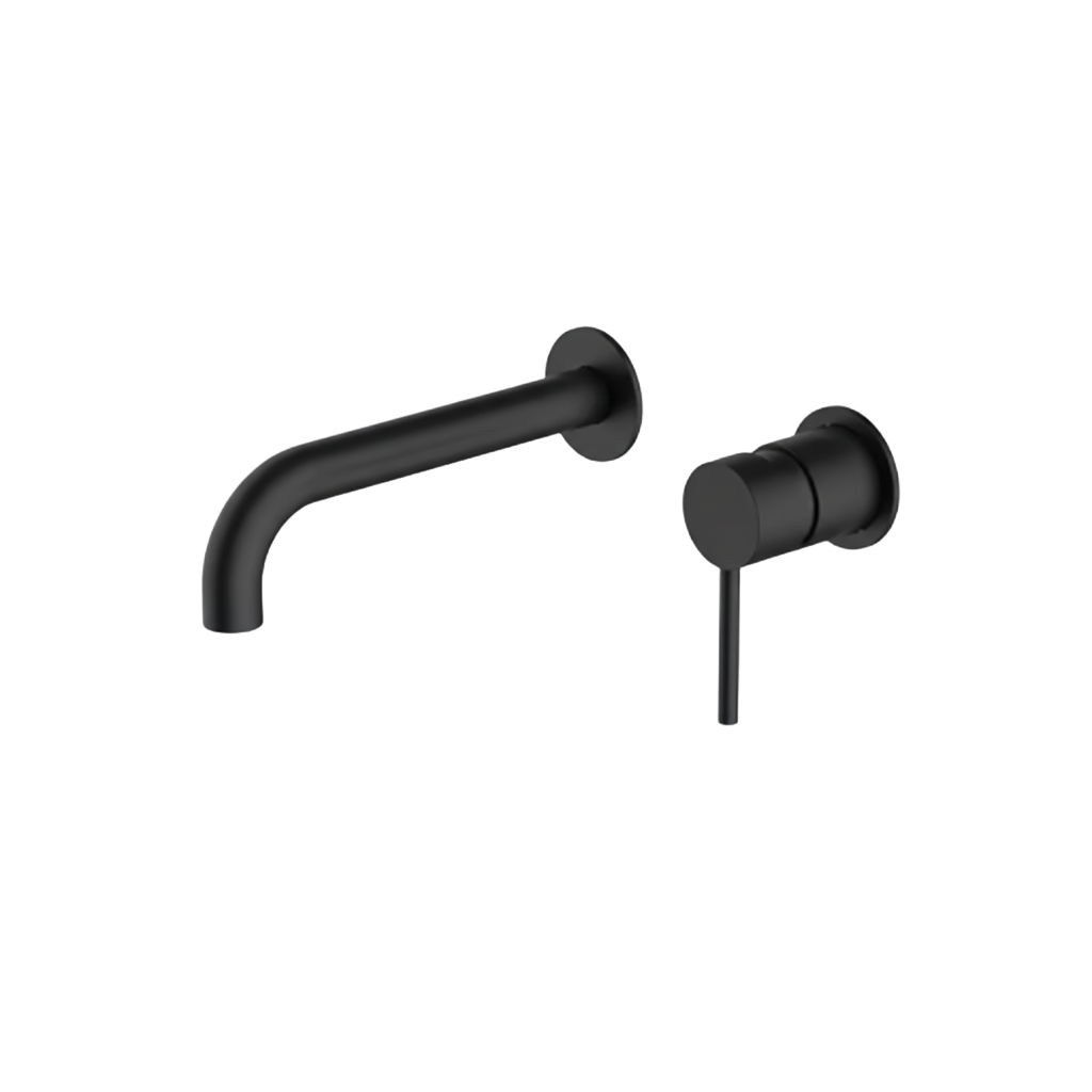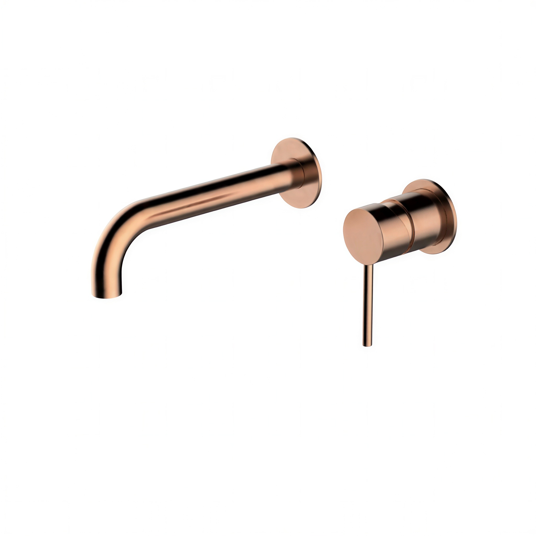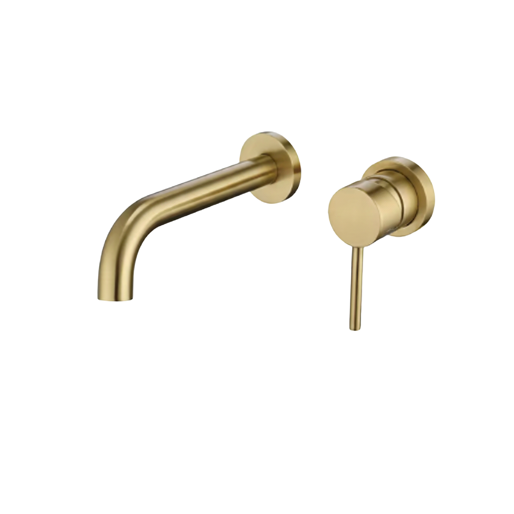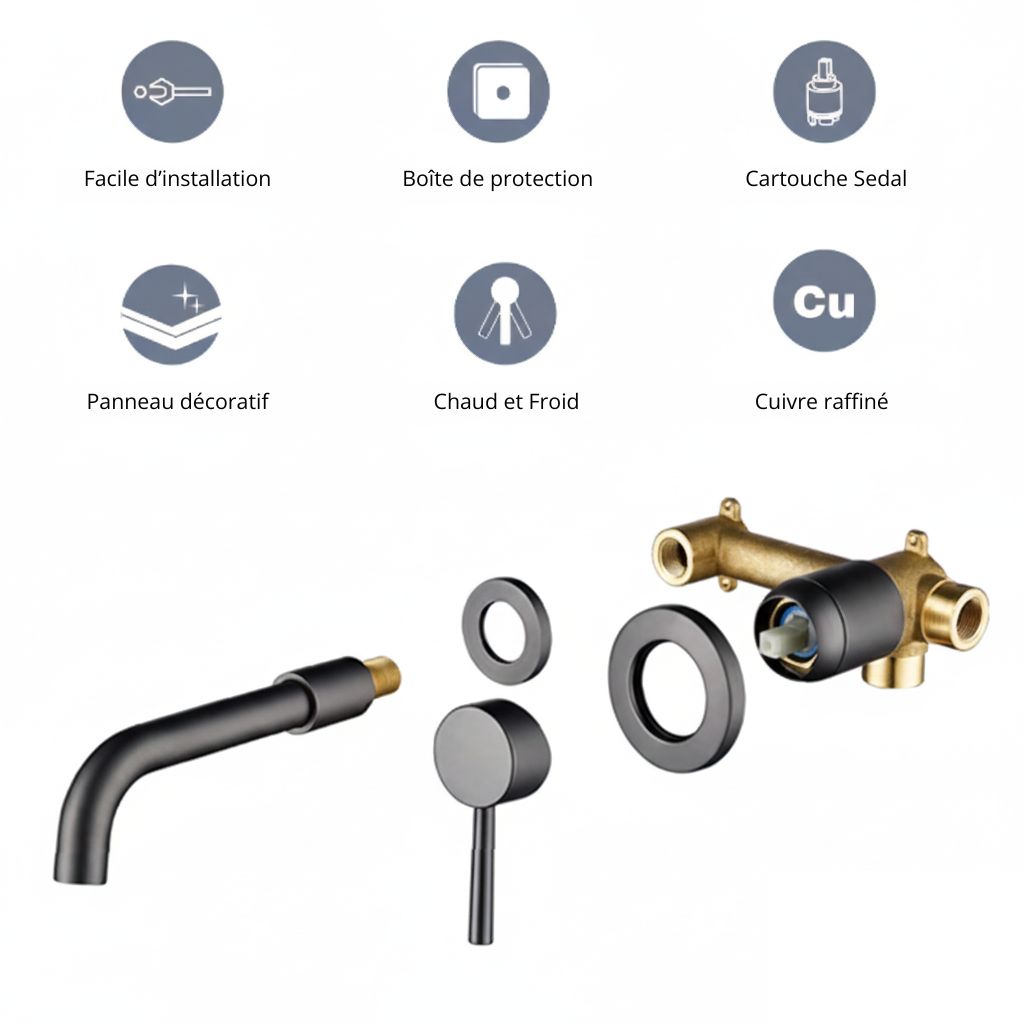 Ce robinet est conçu pour une installation murale encastrée. Il est composé de deux éléments distincts : un bec verseur fixe et une poignée de commande unique. L'ensemble est fabriqué en laiton.